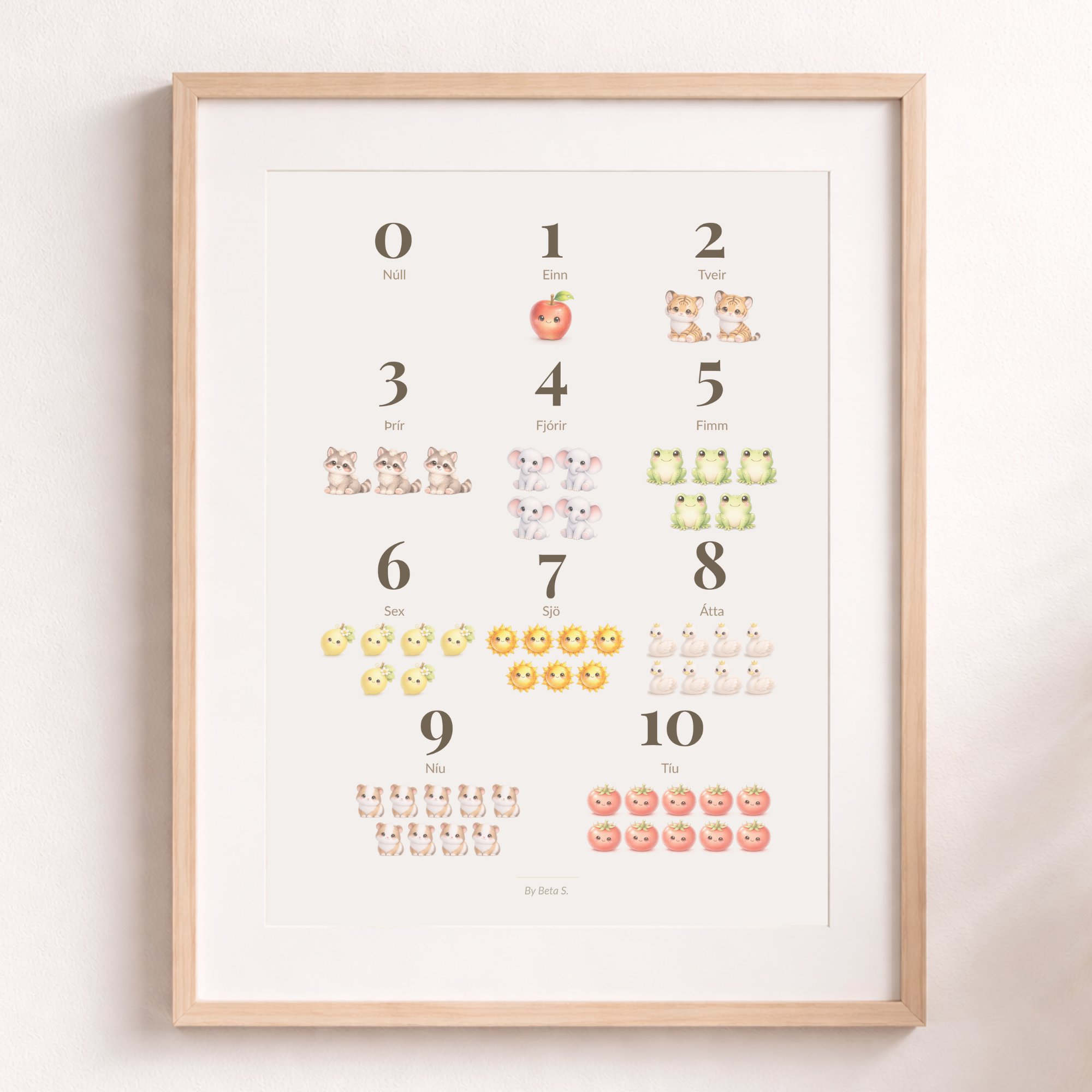 Veggspjaldið sameinar lærdóm og fagurfræði á einfaldan og stílhreinan hátt. Tölurnar 0–10 ásamt mildum pastel myndum hjálpa barninu að tengja tölur við magn á náttúrulegan og leikandi hátt.